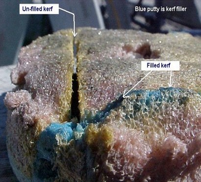 | ABOVE - Many years ago I found wildly different (low to very high) meter readings across the bottom of this foam cored X -Yacht and my hammer soundings were also highly variable. I eventually gave up and recommended a plug be pulled to determine the true condition of the core. What I found was that the core was very well bonded to both inner and outer FRP skins and there was no measurable moisture at all. A great number of the kerfs were un-filled and this produced the variable soundings. Some kerfs were filled with a blue "putty" that sent my meter into the very high range. How many holes will the inexperienced user drill to confirm what the meter is telling him ? How many $15k epoxy bottom jobs have been sold because of false high moisture readings ? | |