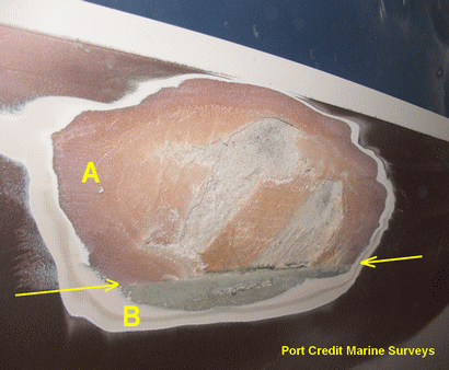 differences when using the meter. So you plunk down $350 - $750 for a meter, stick it on deck and see a reading of 15%, move it a few inches and see a reading of 30%. What does that mean ? Well it doesn't mean "percent". Get that word right out of your head. it means that something on, in or under that surface has higher capacitance but not necessarily caused by moisture. Anything with higher conductivity will produce higher readings. Things likely to have higher conductivity are bottom paints containing metals like copper, carbon and various oxides. If a metal tank or an electrical conductor is touching the inside of the hull or deck, the meter may pick it up. If a metal plate is embedded in the laminate (rudder stocks, chainplates, deck fittings, motor mounts, backing plates etc.) they will likely show higher readings whether you know they are in there or not. Some gelcoat colour pigments contain metals such as aluminum oxide or titanium dioxide which will produce higher moisture readings and there are a few manufacturers who use gelcoats that will show extremely high numbers right out of the mold. Condensation or even dirt on the opposite side of a thin laminate can also cause high readings and carbon fiber will show moisture readings equivalent to your meter being submerged. Very rough non-skid patterns (reduced sensor contact) or an FRP skin that has separated from the core can show false low readings. Boats in salt water areas must be thoroughly washed with fresh water and dried as salt on the surface will hold moisture and give false readings. Taking accurate readings on inside surfaces can be questionable as anyone who has spent time in salt water can tell you, salt is everywhere inside the boat. If paint or coatings are affecting the meter and you are not permitted to sand some off ... Do the next best thing, Try to measure the area of concern from inside the hull, actually you should inspect all inside surfaces where you've found high moisture on the outside.. Moisture meters become more useful when dealing with cored materials as long as the overlying FRP is not much thicker than 3/8" thick (no meter I have seen is reliable at reading much deeper than that) and if the FRP/core bond is intact.. Some manufacturers claim their meters can read up to up to 1 1/2" deep.... maybe in a lab, certainly not in any boatyard I frequent. Moisture in balsa core shows up quite readily on the meter as does water in supposedly closed cell foam cores or water trapped between the FRP and the core. |