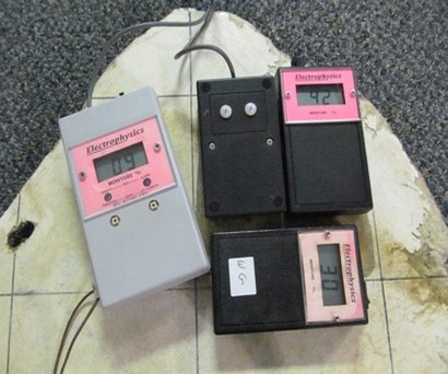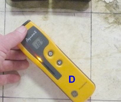 | The Meters Each meter in the following photos is identified by an alpha character. There are two "C"s because that meter has a remote sensor. You will not be seeing meter "E" again as that was so incredibly erratic it was absolutely useless. The calibration of these meters is so sensitive that simply putting it on a surface may be enough of a bump to change it. You will notice that on my meter (A) the adjustment knob has been removed. Years ago I set mine in its most sensitive position and removed the knob. Since we are dealing with relative numbers, as long as you know what those numbers mean in real terms, calibration is irrelevant on cored structure. I am not a fan of analog meters as just sliding them along a surface can cause the needle to move and trying to count gradient lines on the display is a PITA. |