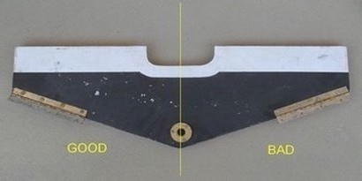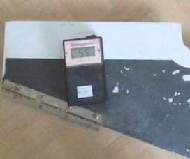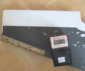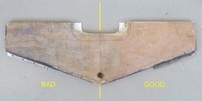 | BAD side - Meter reading 55, very high moisture levels and as we've seen, decay of the plywood has begun. | BAD side - Meter reading 10, as low as a new boat. So why are we seeing low readings over sopping wet plywood ? Because in this particular spot I built in a void where the FRP skin is not in contact with the plywood so no continuity between the skin and the core, the meter sees almost nothing. My hammer will easily find this spot. | GOOD side - Meter reading 15 - would be getting close to a "slightly elevated" rating on balsa core but is actually a little lower than normal for a plywood core. |