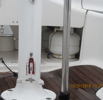 | Below - Notice the CE Approved label on the steering pedestal of this French sailboat then the factory propane installation under the seat and open to the cockpit. Did you know that CE boats are self approved by the manufacturer ? | Below - See the side loading propane locker above the engine compartment, over three AC breakers and the battery box on this Jeanneau powerboat at the 2012 Toronto boat show | |