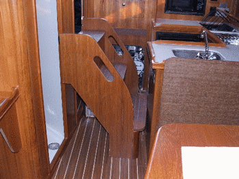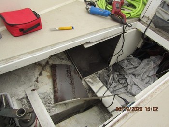 | The powerboat (below left) required three passenger benches to be unfastened and four heavy deck hatches to be removed for engine access. The sailboat (lower right) has no place to put these very heavy steps once the engine is uncovered so you have climb over it to check the oil. Maybe the boat builders are right and no one ever checks anyway. | ||