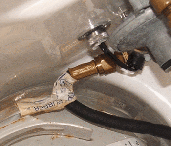 | Below - How long until that razor sharp fiberglass edge cuts through the propane line on this gimballed stove ? | Below - How long before this badly bent hose develops a leak at the swaged joint ? | |