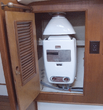| Below - This 2008 Taiwan trawler like almost all trawlers with flying bridges has a propane tank under the bridge helm totally exposed to non-ignition protected wiring. If it leaks it will drain right down the steering/throttle/shift races to the cabin or even the engine compartment - BANG ! | Below - Transport Canada says any appliance must be installed in accordance with manufacturers ..instructions. Paloma says of their instant water heater "DO NOT INSTALL IN A BOAT". Ontario boat builders installed thousands of these units.. | |