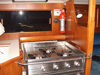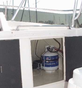 are behind the burners. Do you want to reach through flames to shut off the propane and put out a fire. It doesn't get much stooopider than this. To see how a safe propane system should be installed take a look at Safe Propane Installations on Boats. |  | |