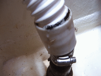 | Many builders are now using these cuff fittings, I don't get it ! only the friction of the ribbing on the hose is holding it in place as the clamps are on the cuff and not the hose and you can see the leak. |  | |