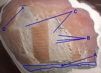 | Next two pictures are of same boat. Clue - New or late model boats with painted topsides (like the one at right) rather than gelcoat and painted over HIN codes. I put the chalk marks on the hull at right because my magic hammer detected some large voids. This one year old boat had a newly painted hull.... are we suspicious yet ? Obviously the buyer was going to walk so the seller offered to open up the void and repair any damage ? Here's what we found........................... (A). shows an area of filler which the repairer says is not theirs. (B) shows the pin hole pattern typical of CoreMat, this is well below the waterline where the manufacturer says there isn't any CoreMat. (C) These light grey areas are where the outer skin is separated from the CoreMat. So what happened to this boat, was the original lay-up this bad or did many hours of impalement (she had been holed just below the area pictured) and beating cause massive sheer stresses which separated the layers? (D) shows that the separation continues upward and outward. How far ? I don't really know and the only way to find out is to keep grinding until you come to the end. This victim of Katrina had been holed, sunk and improperly repaired with an impressive cosmetic coverup. My client wisely walked away. |