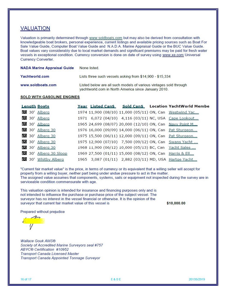up. Surveyed - Jeaneau 27. A good one was selling for about 17k at the time. The one I surveyed for insurance purposes was exceptional and I valued it at 21k. The owner had a fit. He had just spent 25k on racing sails ( I know, I know, its beyond me too) and wanted me to add 25k to his boat value. After being harrassed for more than a week I finally said " Lets go to your sailmaker together and ask him what these sails are worth today. Whatever he says they're worth I'll add to my valuation". Off we went and asked the sailmaker. His response .... " If you bring me a case of beer, I'll take them off your hands". The broker knows that if he prices the boat too high there will be no buyers and he often has to contend with a seller's unrealistic expectations. If the broker is having a really good year he may encourage his clients to hold out for a higher price. if he needs money that month and he needs to unload a couple of boats as quickly as possible to make the mortage payment, maybe he'll encourage lowball offers for a quick sale. Canadian sellers have been slow to realize that boat values have crashed as the US economy has flooded the market with desperate sellers and many Canadian buyers are looking south of the border. The seller (as have we all) has often spent an ungodly amount of money on his boat and thinks he has increased its value. If a house seller spends 40k on a new roof do you think his house is worth 40k more than others on the street... Not a chance, its supposed to have a roof. If you spend 20k on a 1994 Chevy Impala, what do you have .... a really nice 1994 Chevy Impala. Surveyed - Bayfield 32' . They were selling for about 60k at the time. This one however was unique. In its 13 year life, the engine had never been commisioned, the sails had never been raised, the original wrapping was still on the head and stove. The couple had it shipped to their marina and came down every Sunday to sit in the cockpit with a glass of wine. This was a 13yr. old brand new boat ! I pulled a number out of the air and valued it at 74k. This was the first time I had ticked off the seller, the buyer and the broker at the same time. It had been sold for $94,000.00. Occasionally, like the previously mentioned Tanzer a broker sells to a less than expert buyer for above market. I can't fault him for doing the best for his client but the surveyor is the only one who has to put a value in writing. On a few occasions I have been asked to increase value to satisfy a broker or for financing ..... it ain't gonna happen ! I am not perfect ( my grandkids would disagree) and was once convinced by a broker that I was in error and did adjust my valuation. To get me to do this again you better have a very convincing argument and substantial documentation to back it up. Surveyed - Trojan Tri-cabin that was sold for 38k. It was a dangerous piece of junk that I valued at 18k …….. the deal still went through, at the asking price ! At the same time I knew of another Tri-cabin listed for 28k and in exceptional condition. It would have been a serious conflict of interest to inform my client that " Hey there is a much better boat 1 mile from here for 10k less". I had to bite my tongue all the way through that deal. I felt really bad about that one but getting into that kind of conflict could cost me my SAMS ® Accreditation. Surveyors are supposed to appraise at "Market Value" what does this mean ? it could be reasoned that the boat is worth whatever someone is willing to pay for it and that is close to the definition of "Market Value" So if a buyer is willing to pay 40% over the average does that mean I'm going to value the boat at that ? Not a chance. This is where surveyors and brokers come into conflict. Surveyed - Hunter 30. There were 11 of these listed on soldboats.com with a low selling price of $12,000.00 and a high of $40,000.00. The owner of the one I surveyed was asking $43,000.00 and bragged that he had just spent 28k on it. This boat might have been worth 40k if he had spent another 50k on it.There were a number of serious issues on this sinker (hurricane ?) covered up with bondo and new alwgrip. I valued it at 28k and I'm having second thoughts about that. The broker, the buyer and the seller all have vested interests in the valuation but the surveyor is the only one standing in front of the judge. Shown below is the VALUATION page from my survey reports showing some of the data I use to determine value. Note that in the soldboats.com listings I also can pull up the original sales listing for photos and more details on each boat.. ![]() |