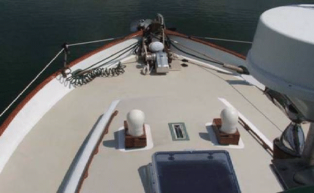 ![]() Isle of Skye ground tackle arrangement with snubber running out starboard hawsepipe and the all important washdown hose to port. |