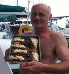 to fish. We use only two kinds of lures, a 4” plastic squid or a 6” cedar plug and both of these can be purchased at any Wal-Mart. We never use bigger lures because The effort and mess of cleaning a 30lb. mahi is just too much. A 10lb. mahi is the perfect size for cleaning and the work involved in getting it aboard is reasonable. We trail a 100lb. test line with a steel leader (mahi have incredible teeth ) not because I want to catch anything that weighs 100lbs. but because when we do get a bite we don’t slow down to fight it we just drag it aboard. Sometimes if you are lucky lunch will jump aboard. We have picked flying fish off the decks and were once bombarded by a school of squid jumping into the dinghy. From the Delaware down through Florida, blue crabs are easy to catch. Take 100’ string and tie on any kind of left over bone from lunch (pork chops, chicken wings) every 10’, cast out the string and have a beer. Haul the string in every 15 min. and have your 5gal. bucket ready. The trick to landing these aggressive little creatures is to have your net in the water before you haul them up or they will release the bait as soon as they see the net coming towards them. Blue crabs are also known as soft shell crabs when they have molted and can then be eaten whole. In their hard shell state it takes a lot of them to make a meal. Barry, the great lobster hunter from Burlington taught me how to pole spear lobster; unfortunately I shot more rocks than lobster and found it easier to just grab the little buggers by the antennae. Note: Bahamian fishing laws are chaning constantly. Play by their rules, it's their country. Lobster are found under rocks, ledges, and along break walls. Often all you will see are long antennae sticking out…grab them ! If you get both antennae you have a better chance of holding on. We found many lobster in 5 to 6’ of water very close to shore. Take them immediately back to the dinghy as small sharks or barracudas may try to steal your lunch. |