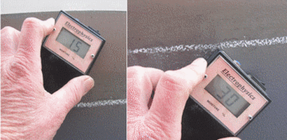 | AT RIGHT - Note the chalk line on this sailboat bottom and see that the meter shows 15 above the chalk line and 30 below. .. we have found an anomaly that does not necessarily indicate higher moisture The higher reading may be caused by a different barrier coating under that area or the fact that the hull laminate along that chalk line changes and something in that change is affecting the meter. All we know is that something is different and worthy of further inspection. | ![]() |