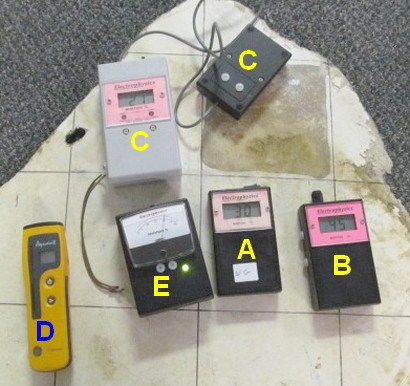 | The Meters Each meter in the following photos is identified by an alpha character. There are two "C"s because that meter has a remote sensor. You will not be seeing meter "E" again as that was so incredibly erratic it was absolutely useless. The calibration of these meters is so sensitive that simply putting it on a surface may be enough of a bump to change it. You will notice that on my meter (A) the adjustment knob has been removed. Years ago I set mine in its most sensitive position and removed the knob. Since we are dealing with relative numbers, as long as you know what those numbers mean in real terms, calibration is irrelevant on cored structure. I am not a fan of analog meters as just sliding them along a surface can cause the needle to move and trying to count gradient lines on the display is a PITA. |
