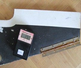 | BAD side - Meter reading 55, very high moisture levels and as we've seen, decay of the plywood has begun. | BAD side - Meter reading 10, as low as a new boat. So why are we seeing low readings over sopping wet plywood ? Because in this particular spot I built in a void where the FRP skin is not in contact with the plywood so no continuity between the skin and the core, the meter sees almost nothing. My hammer will easily find this spot. | GOOD side - Meter reading 15 - would be getting close to a "slightly elevated" rating on balsa core but is actually a little lower than normal for a plywood core. |
