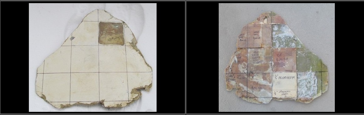 | ABOVE - Photo at left shows low moisture after the panel had been left outside in slightly sub-zero temperatures overnight. Photo at right shows the same square after the panel had been brought indoors for a few hours. Many years ago I did a lot of testing with frozen blocks of bits of decks and hulls and was convinced that I could determine moisture content in frozen core ..... I was wrong ! What worked in the kitchen did not work in the field. In the kitchen at ambient temperature the meter was warm enough to create a thin film of moisture on the frozen bit and register on the meter. Outside in below freezing temperatures this did not occur. When water freezes it expands by about 8%, The crystallization that causes the expansion results in a lot of non-conductive space within the water thereby greatly reducing the effectiveness of the meter. When meters are unreliable we can use the percussive sounding method, unfortunately this too goes out the window because frozen core whether balsa or plywood sounds solid. I need the work as I don't have much in the winter months and may survey certain frozen boats (balsa cored hulls excepted) as long as you are willing to live with the limitations (and put it in writing). My best advice .... wait til' spring. | |
